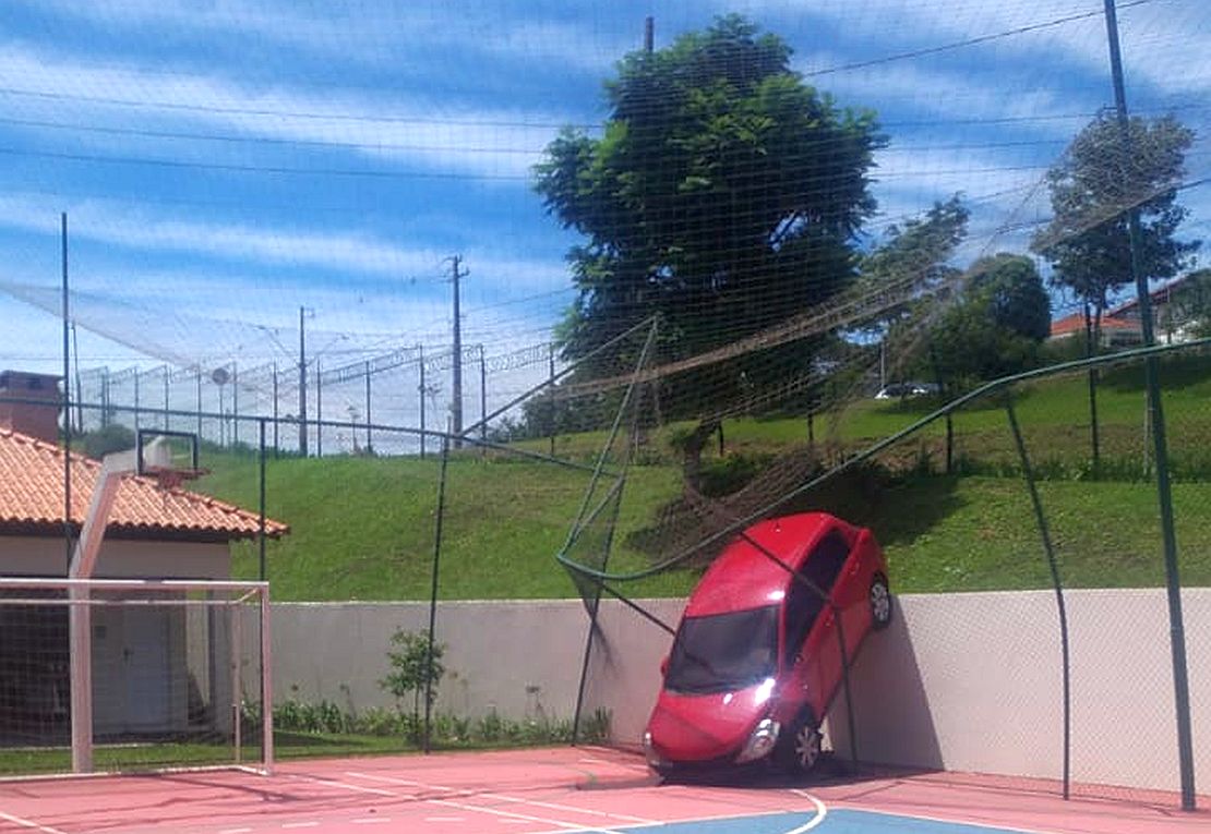 Para sua surpresa e igual preocupação, o carro ficou bastante danificado. Por sorte, ela obviamente não se feriu e por muito mais sorte ainda, não havia nenhuma criança brincando na quadra esportiva do condomínio.