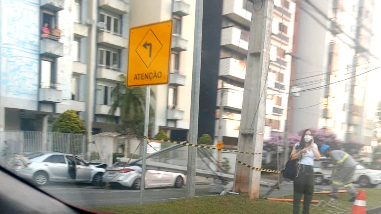 Um carro bateu e derrubou um poste na Avenida Iguaçu, bairro Batel, próximo ao Hospital Santa Cruz, em Curitiba. O acidente, que aconteceu no final da tarde deste sábado (20), teve o acionamento de equipes do BPTran, Copel e Siate.