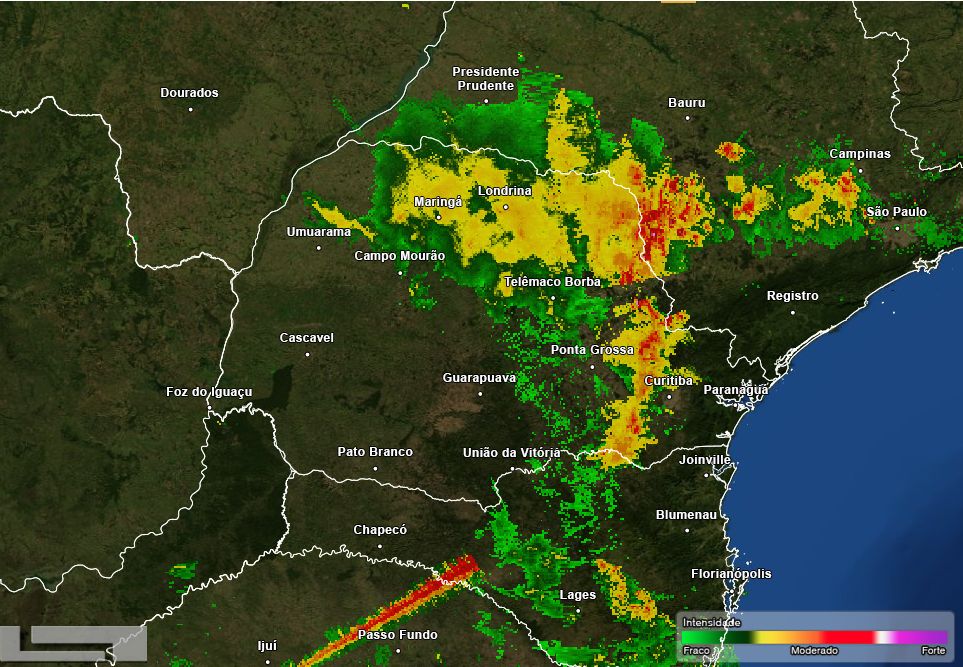 Segundo o Simepar, em nota por volta das 19h, “as chuvas seguem ocorrendo em boa parte do Estado nesta noite de quarta-feira. No norte são mais fortes, com condição para ventos fortes. Nos Campos Gerais são moderadas, com alguns raios, e apresentam deslocamento preferencial em direção a RMC”.