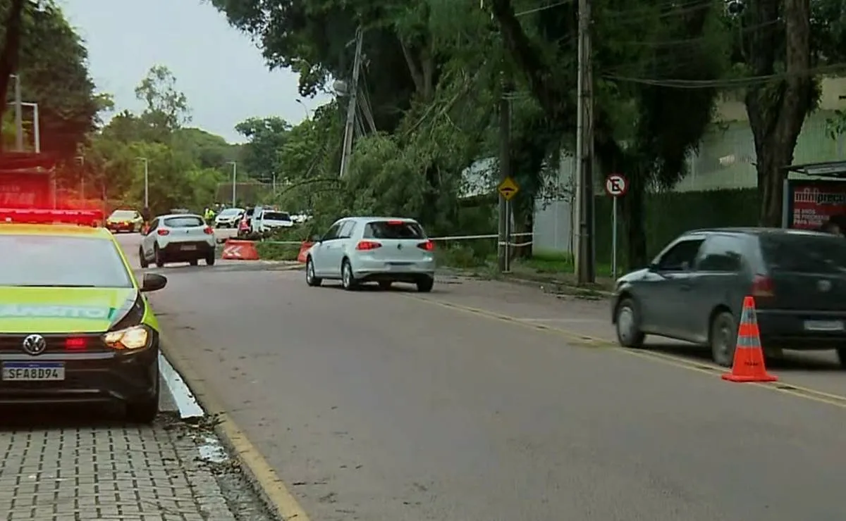 A queda da árvore ocorreu na tarde desta quinta-feira (21), após o forte temporal que atingiu Curitiba. Foram registradas quedas de árvore, alagamentos e até um ônibus atingido por uma araucária que caiu no bairro Orleans. Uma mulher ficou ferida.