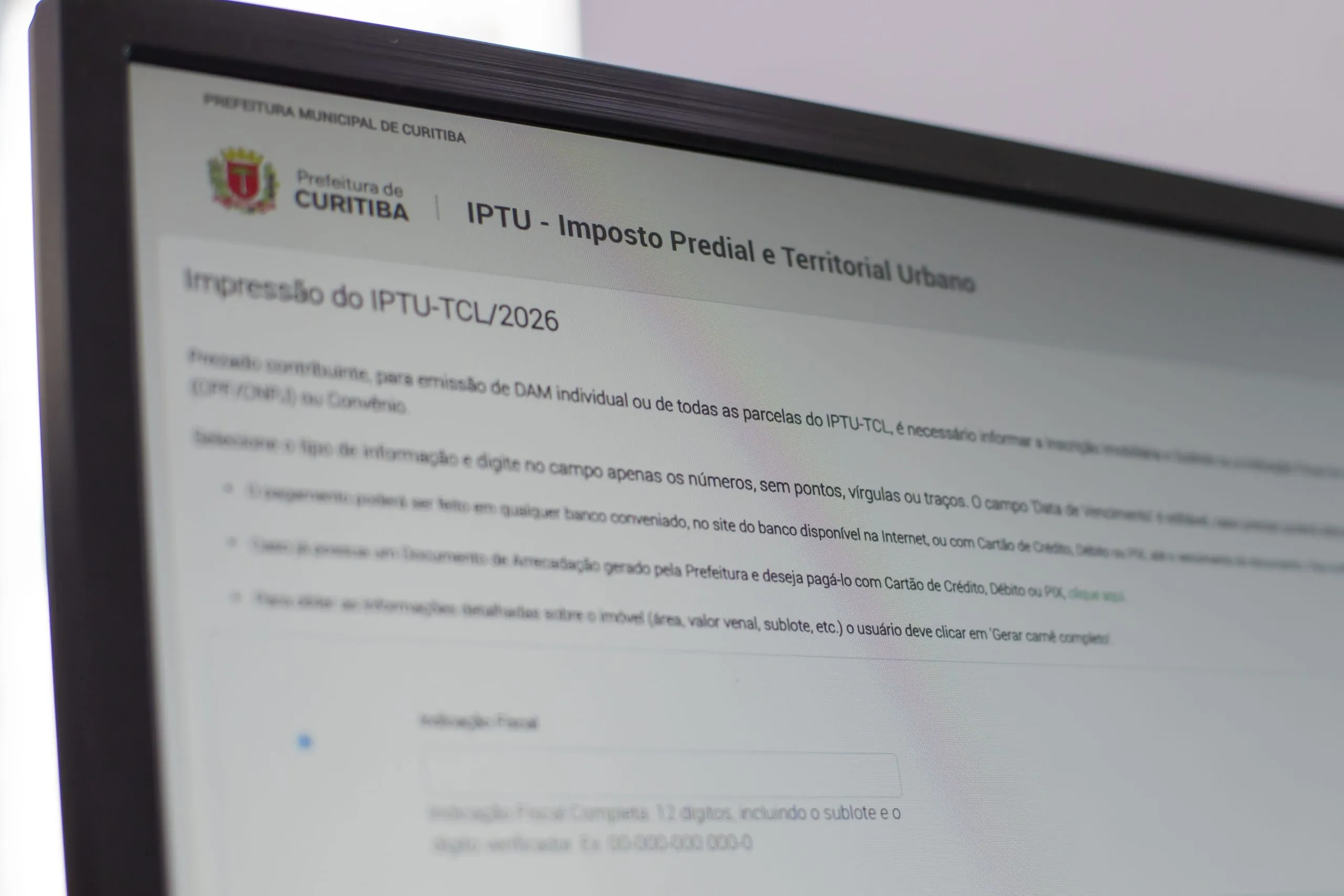 A Prefeitura de Curitiba disponibiliza a partir desta quinta-feira (19/2) a emissão online das guias do Imposto Predial e Territorial Urbano (IPTU) 2026. Os contribuintes podem acessar o documento pelo site oficial da prefeitura ou pelo aplicativo Curitiba App, antes mesmo do início da entrega física pelos Correios, prevista para a próxima semana.