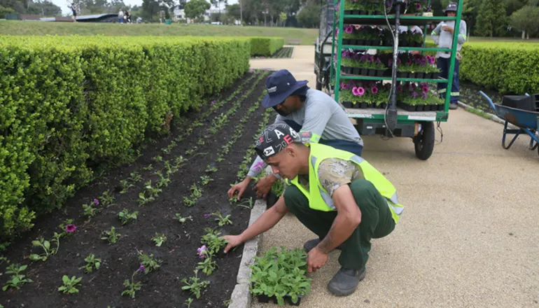 Na quinta-feira (04), funcionários finalizaram a troca de 80 mil flores dos canteiros laterais, onde foram plantadas petúnias roxas. O trabalho durou uma semana e contou com o auxílio de carrinhos elétricos, que além de agilizarem o serviço – cada um transporta 80 bandejas por viagem – não emitem gases de efeito estufa.