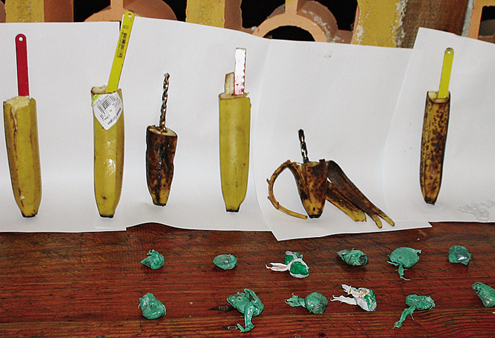 Em cada fruta, cuidadosamente, o garoto colocou uma serra ou broca. Em outras, colocou buchas de maconha. Em quatro bananas foram encontradas 12 buchas de maconha, quatro serras e duas brocas.