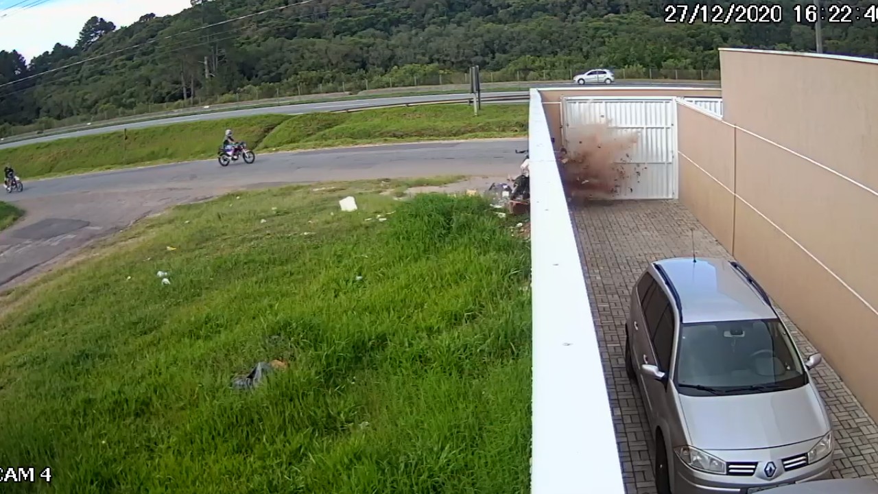 Um jovem de 22 anos perdeu da moto e bateu em cheio contra o muro de uma residência em São José dos Pinhais, na região metropolitana de Curitiba. Imagens das câmaras de segurança do imóvel flagraram o momento da colisão, em que a moto bate direto contra o muro da casa.
