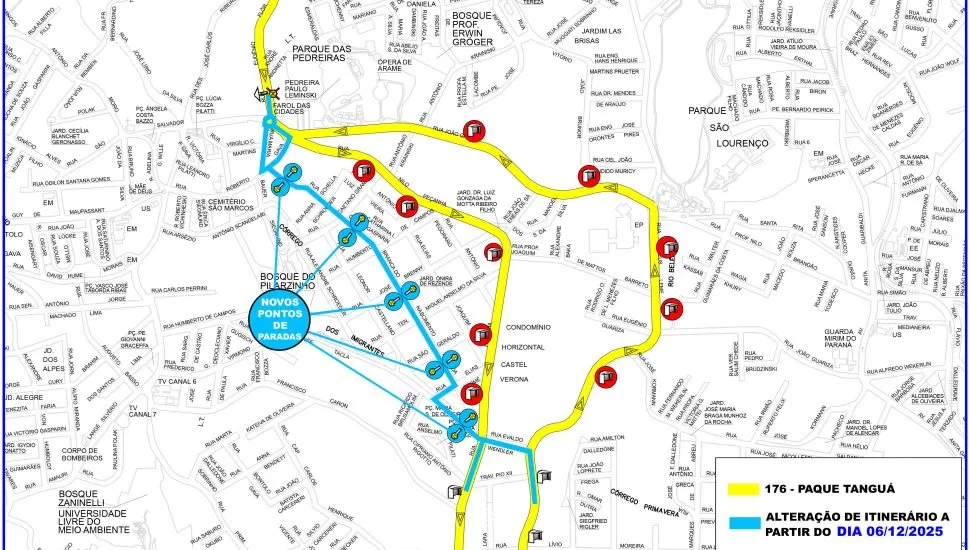 A partir deste sábado (6/12), a Urbanização de Curitiba (Urbs) alterará o itinerário da linha 176 – Parque Tanguá. A mudança afetará cerca de 260 passageiros que utilizam diariamente essa linha de ônibus.