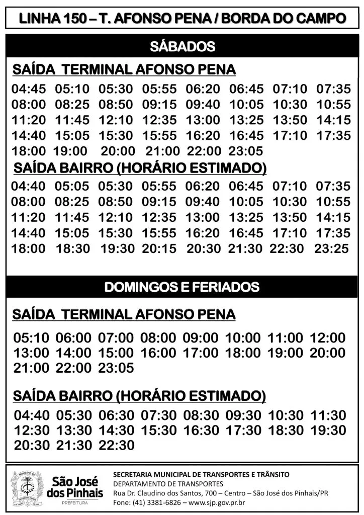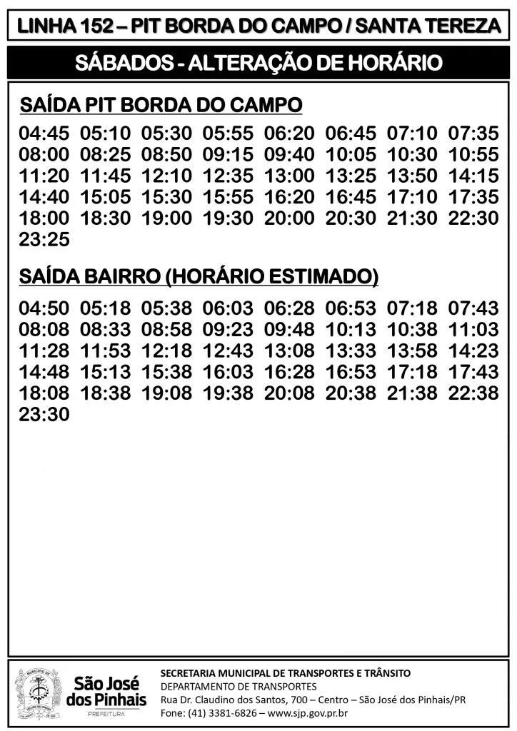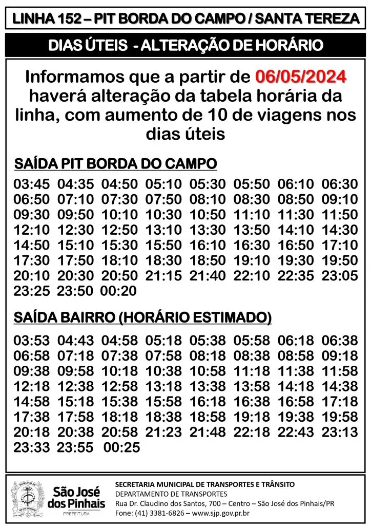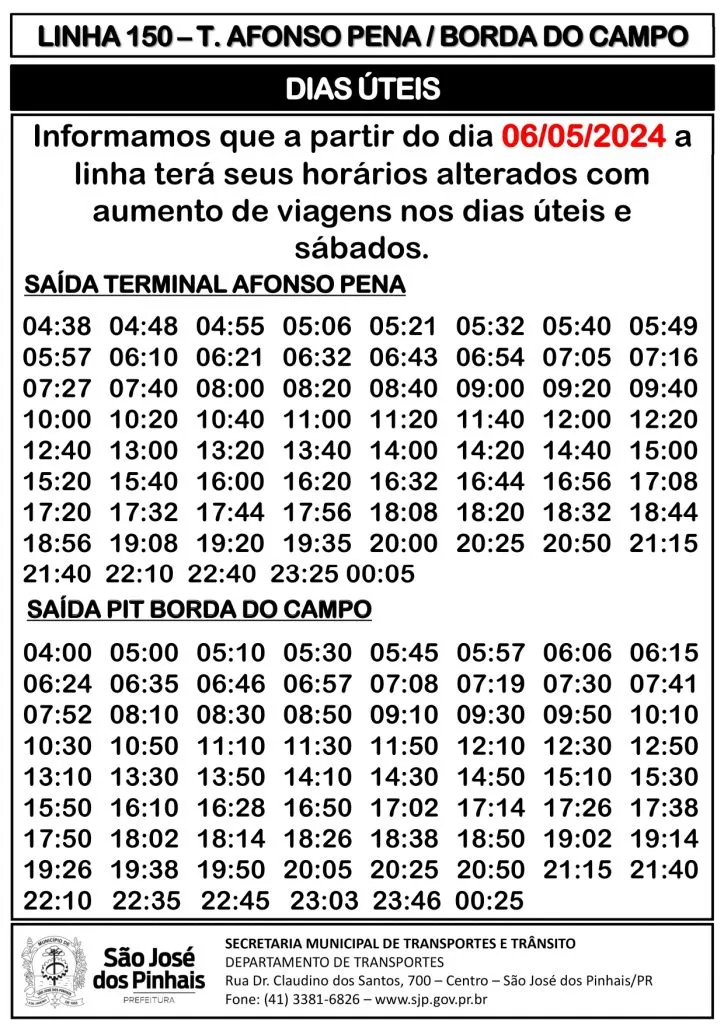 A partir desta segunda-feira (06), três linhas do transporte coletivo de São José dos Pinhais, na Região Metropolitana de Curitiba (RMC), vão ter os horários alterados. De acordo com a Secretaria de Transportes e Trânsito (Semuttran), o número de viagens de duas linhas também vai aumentar.