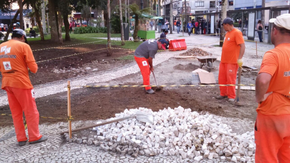 O piso da Praça Carlos Gomes já deve “voltar ao normal” esta semana. É que o local onde abriu uma enorme cratera, no dia 22 de junho, já foi fechado e uma empresa terceirizada da prefeitura já recolocava o petit pavê da calçada, na tarde desta terça-feira (16), última etapa do conserto.