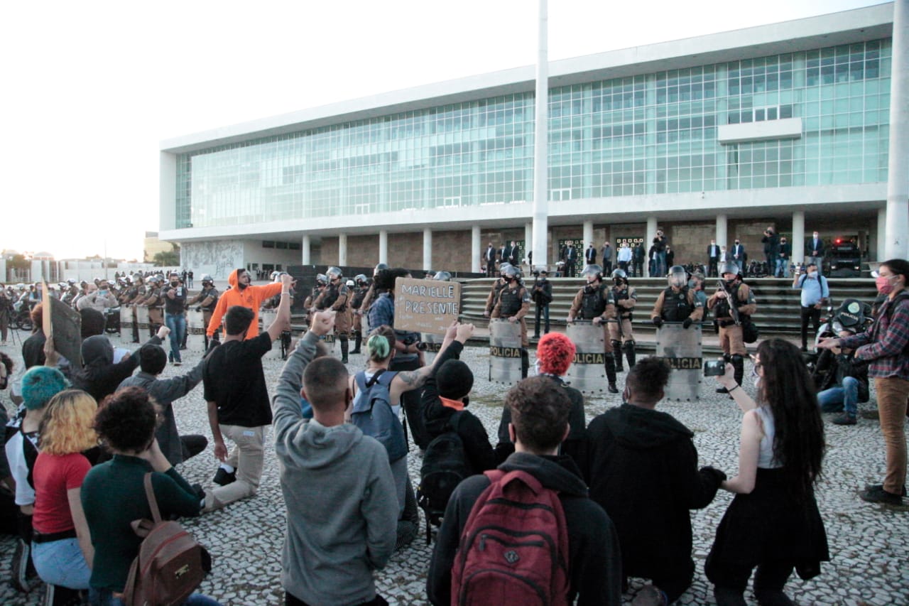 Com gritos de “Fora, Bolsonaro”, manifestantes confeccionaram cartazes no início do protesto. As faixas pediam por uma nova democracia e também lembravam a morte de Marielle Franco, vereadora do Rio de Janeiro que foi assassinada em março de 2018.