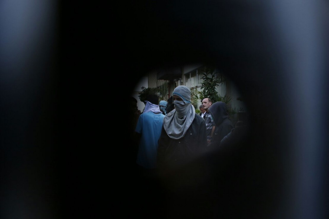Uma foto publicada pela página “Ocupa UFPR”, no Facebook, mostra duas pessoas com rosto coberto usando blocos de concreto para obstruir uma porta do prédio. Parte do grupo que participou da tomada do campus usava máscaras.