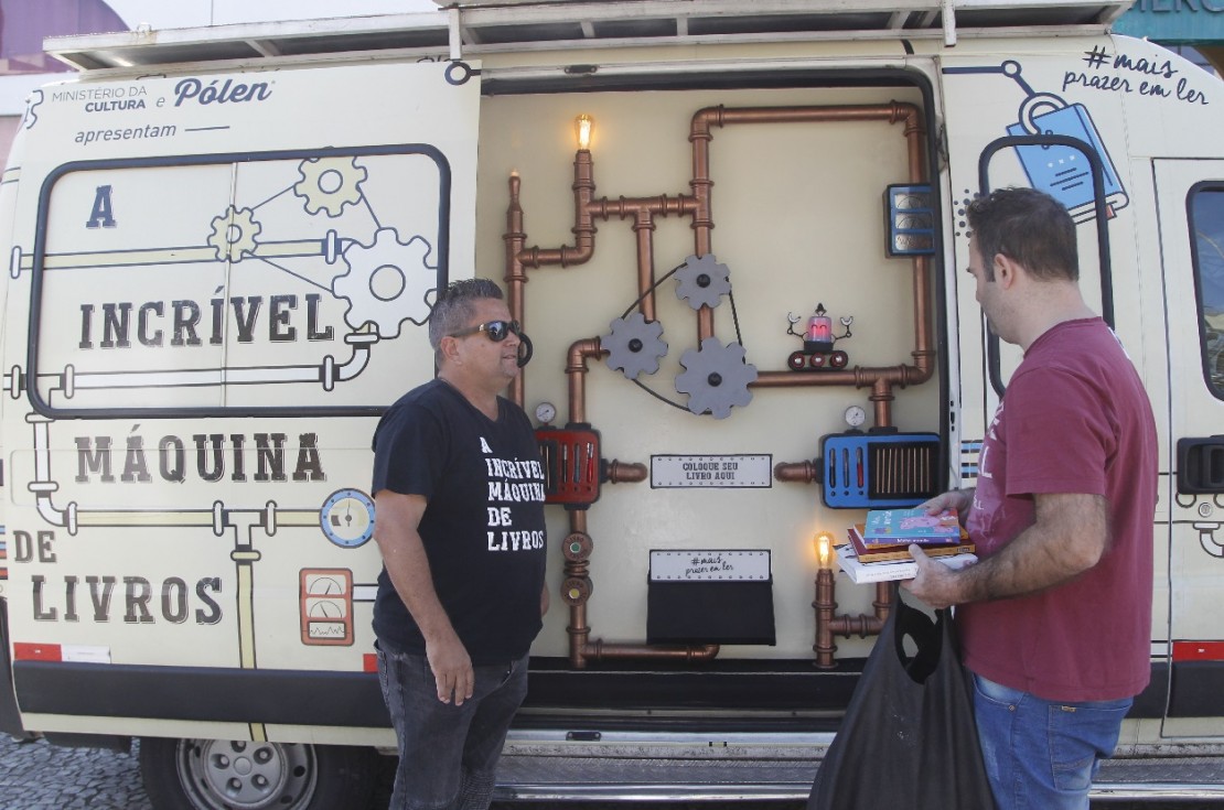 Você já imaginou pegar um livro usado, colocar numa máquina e esse livro ser transformado em outro? Essa é a ideia da Incrível Máquina de Livros, que fica na Praça Rui Barbosa até quinta-feira (19). O projeto, inédito, busca incentivar a leitura atraindo a atenção do público pelo viés da fantasia e da imaginação.