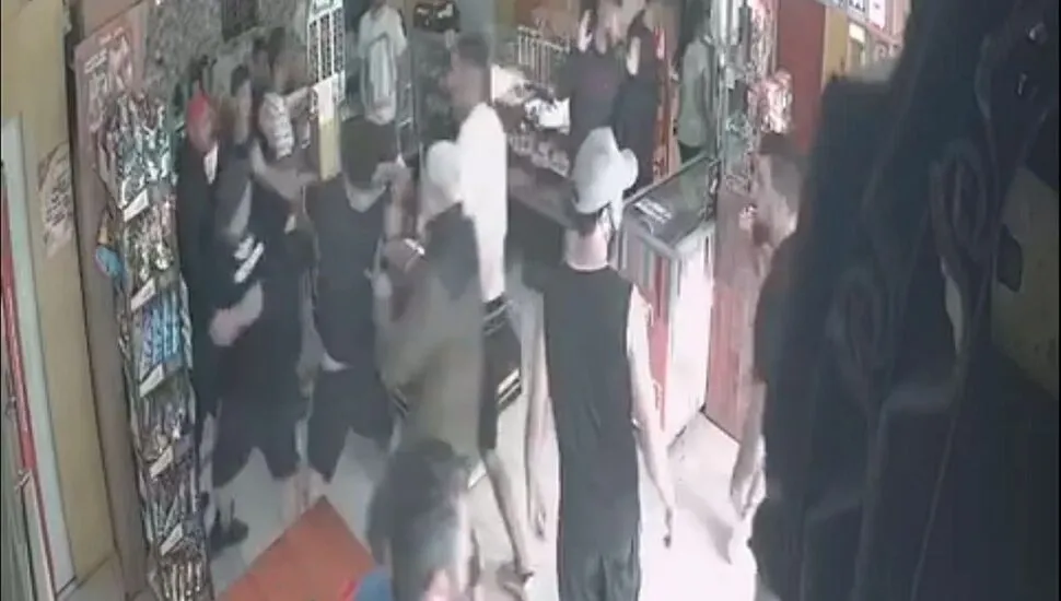 Socos e chutes são trocados pelos jovens próximo ao balcão da confeitaria. No lado de fora, uma pessoa gravou o momento da fuga das pessoas. Percebe-se uma pessoa com arma de fogo em uma das imagens.