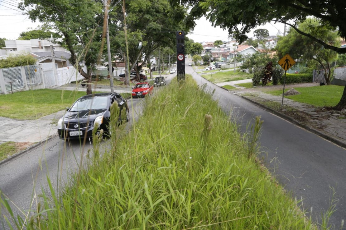 Uma lombada eletrônica na Rua Percy Feliciano de Castilho, na altura da Rua Luiz Barreto Murat, no Bairro Alto, em Curitiba, está tomada pelo mato. Pela altura da vegetação, percebe-se que o corte não é realizado há algum tempo. As fotos foram tiradas na tarde desta terça-feira (5).