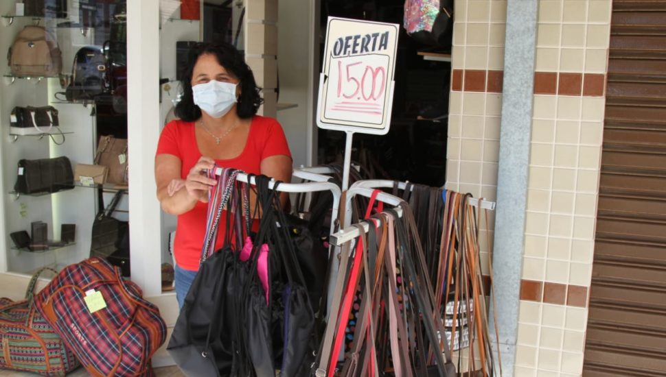 A loja de bolsas de Valéria Ramos, 57 anos, no São Braz, ficou 20 dias fechada durante o isolamento social. Agora, a comerciante decidiu reabrir para tentar recuperar um pouco as vendas e atenuar o acúmulo de contas. Com o marido no grupo de risco por ser hipertenso, ficou somente com Valéria a missão de tentar levar o sustento para casa durante a pandemia. Com tanto tempo sem vender absolutamente nada, o medo tomou conta da comerciante para pagar a despesa mensal de R$ 7 mil do estabelecimento.