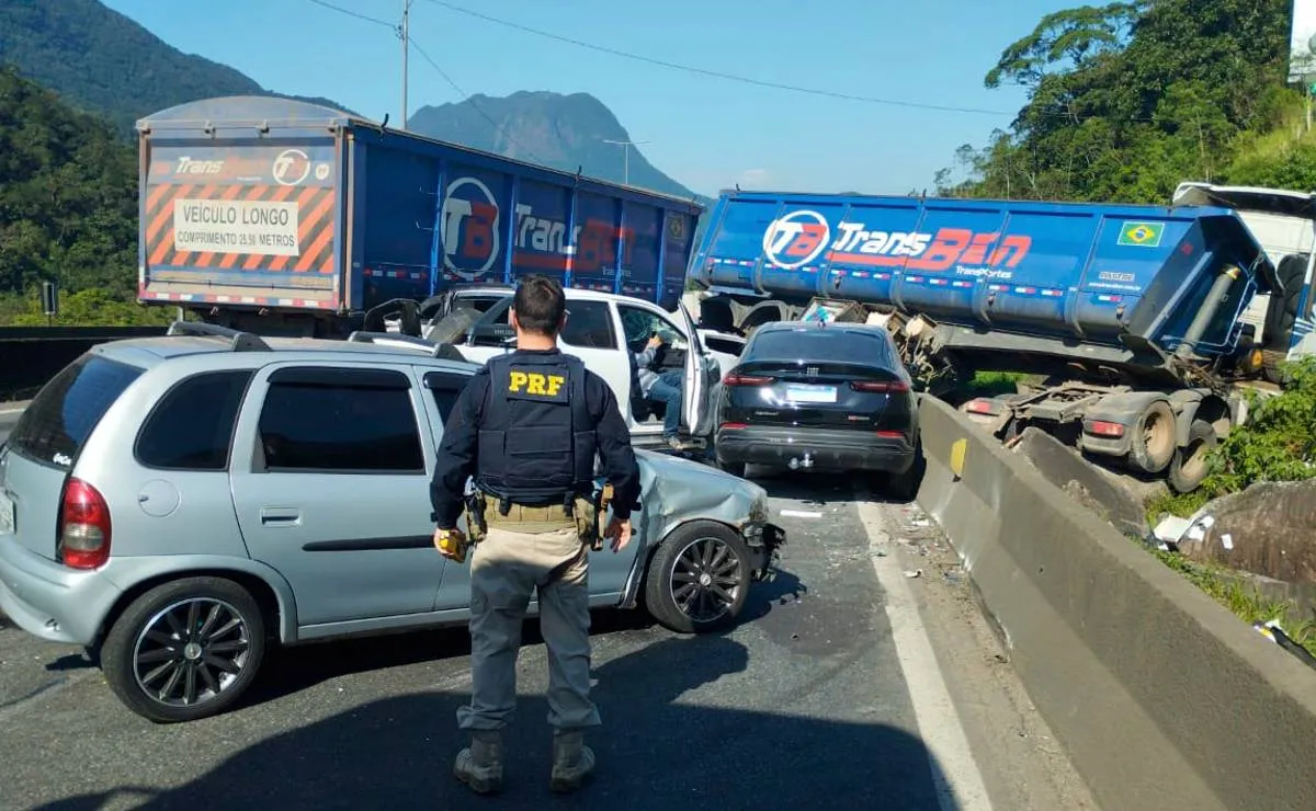 Um engavetamento envolvendo ao menos nove veículos, sendo quatro deles caminhões, quatro carros e uma caminhonete, causou o bloqueio total de pista na BR-376, no sentido Santa Catarina. O acidente ocorreu pouco depois das 11h desta quinta-feira (23).