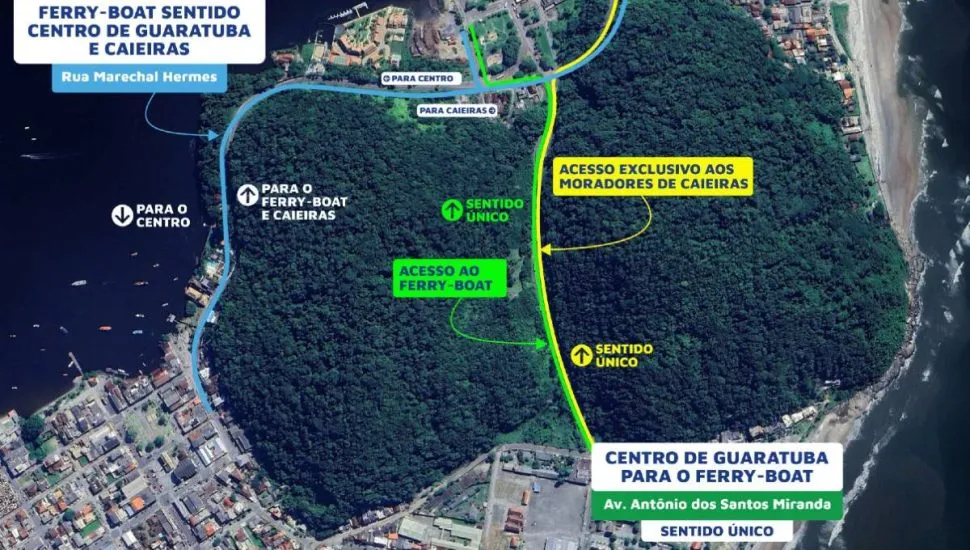 Todo o tráfego saindo do ferry boat em direção ao centro de Guaratuba vai passar pela Rua Marechal Hermes, que permanecerá com sentido duplo. E o tráfego saindo do ferry para Caieiras permanece sem alterações.