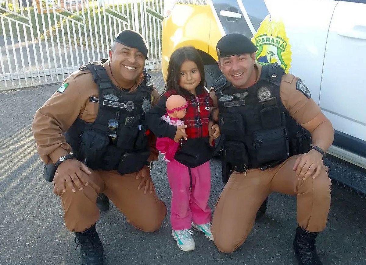 A tarde de sexta-feira (19) foi de surpresa e carinho para a pequena Ketlyn Camilly Paole dos Santos, 3 anos, filha da Aline Paole Borges. A menina, que adora a Polícia Militar (PM), ganhou um abraço do cabo De Conti e do soldado Vaz, que pertecem à equipe do 17.º Batalhão da PM.