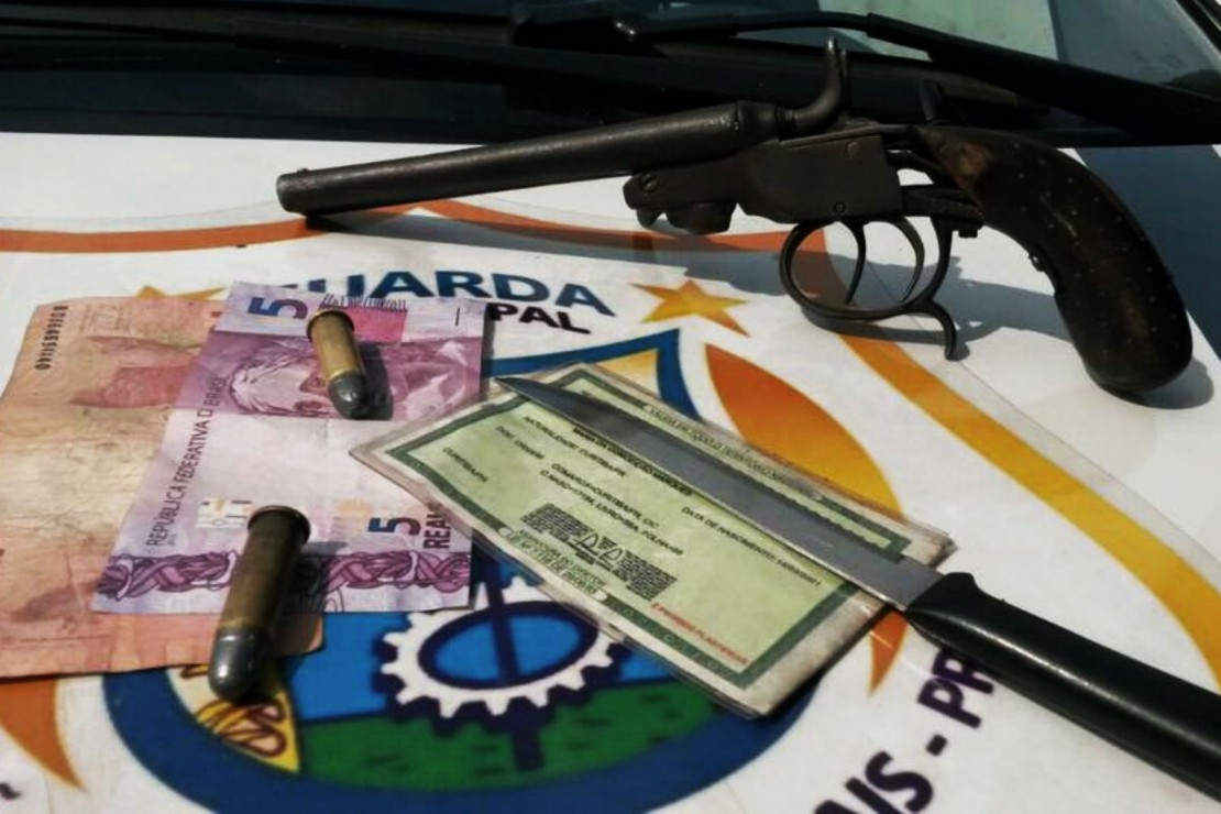 Suspeito de uma tentativa de assalto a um comércio no bairro Afonso Pena, em São José dos Pinhais, na tarde de quarta-feira (17), um adolescente de 15 anos foi contido por populares até a chegada da Guarda Municipal. Com ele, foi apreendida uma garrucha calibre 32.