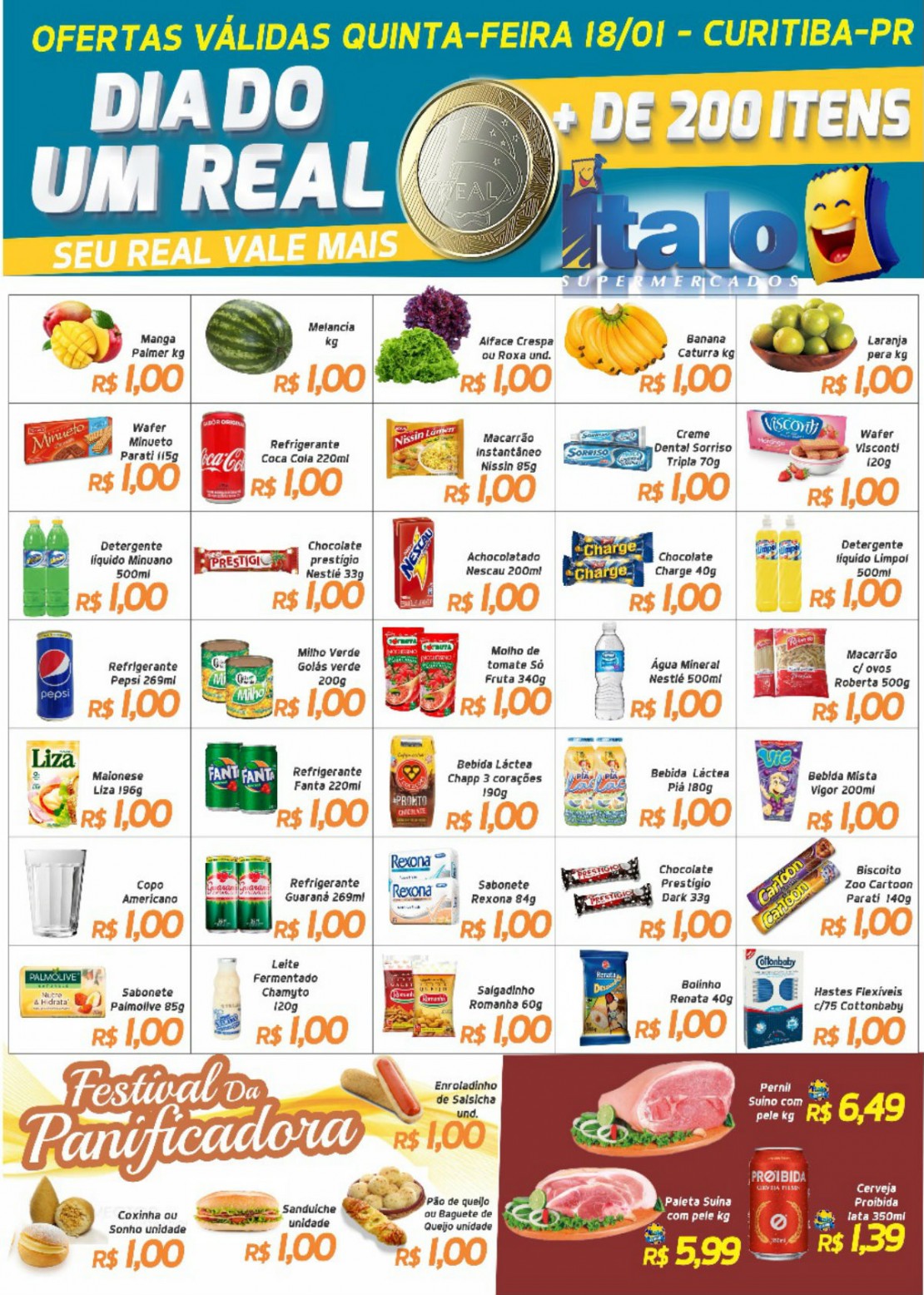 Para atrair novos clientes neste período de crise econômica, um supermercado no bairro Atuba, em Curitiba, optou por uma estratégia ousada: oferecer mais de 200 produtos a R$1. A promoção do Supermercado Ítalo é nesta quinta-feira (18) e vale para algumas marcas de produtos de alimentação e higiene, entre eles macarrão, molho de tomate, leite condensado, biscoitos, frutas (por quilo), creme dental e detergente.