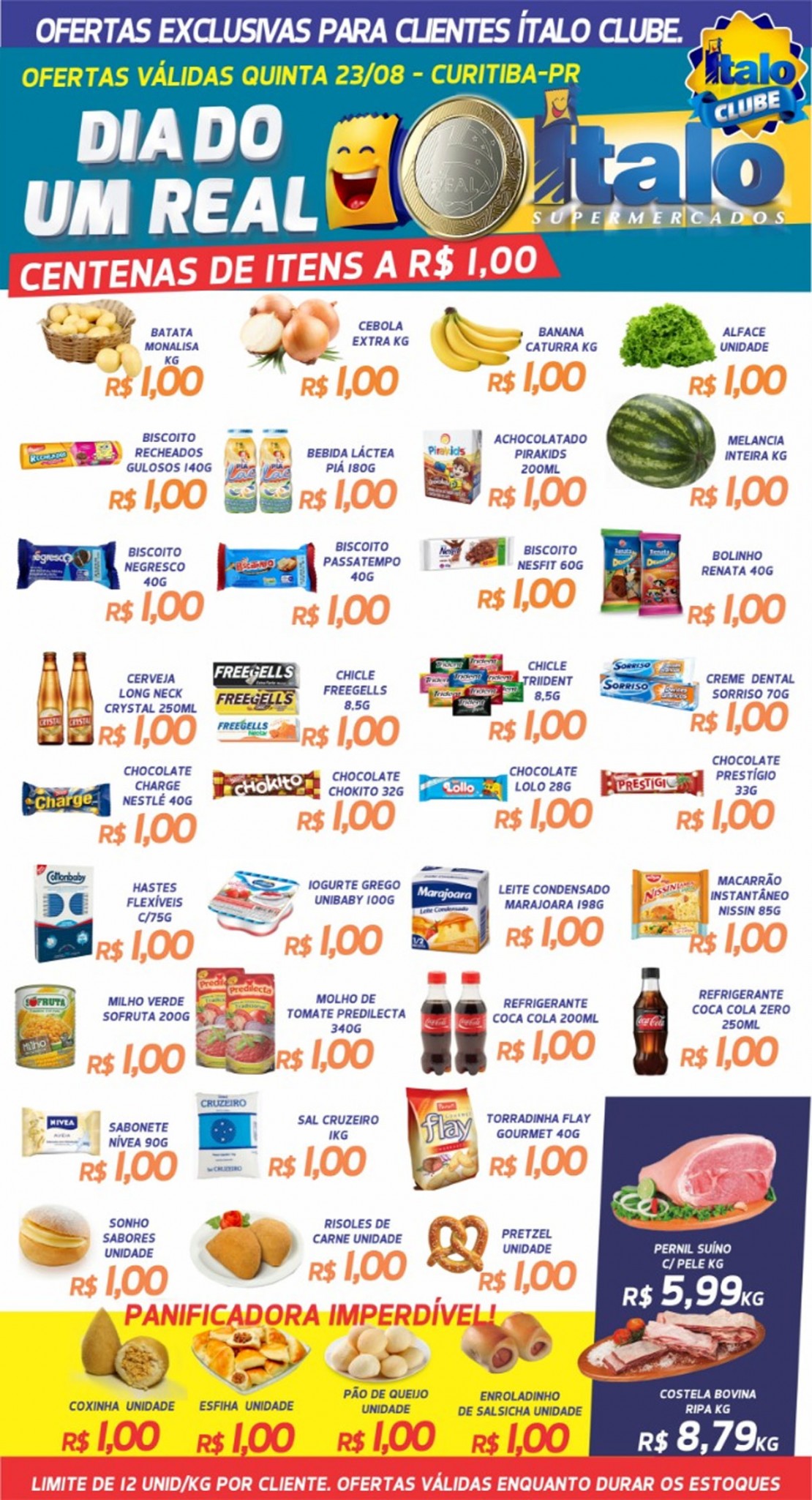 A rede de supermercados Ítalo realiza, mais uma vez, a promoção com produtos a R$ 1. São centenas de itens por este preço apenas nesta quinta-feira (23). No folheto da promoção é possível bolar um almoço com refrigerante e sobremesa por apenas R$ 3! Duvida? Confira abaixo…