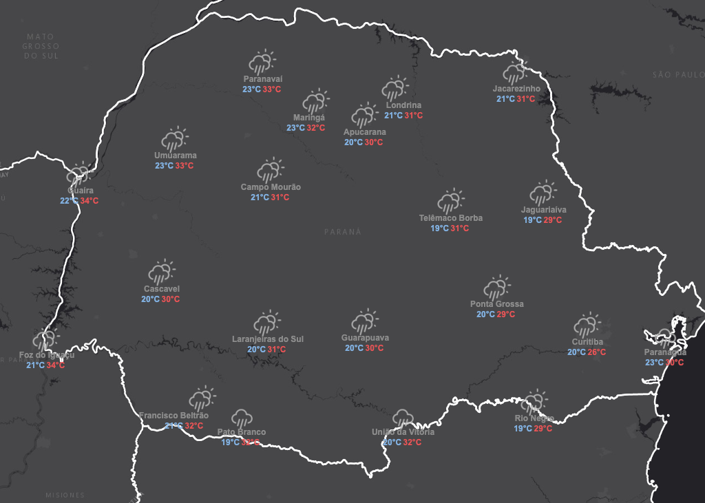 Diferente de Curitiba, onde a temperatura até fica um pouco mais agradável do que o registrado nos últimos dias, no litoral do Paraná o tempo continua quente. A máxima em Paranaguá, por exemplo, chega aos 30°C. Veja a previsão do tempo para o Estado todo: