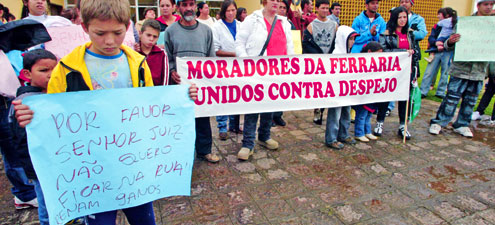 Um grupo de cerca de 60 moradores do bairro Ferraria, em Campo Largo, realizou ontem uma manifestação em frente ao fórum cível da cidade. O objetivo da ação foi sensibilizar os poderes Executivo e Judiciário no município na busca por uma solução para o impasse gerado em torno da ordem de despejo, que visa a retirada de 12 famílias do Jardim São Lucas. Os moradores solicitaram uma intervenção da prefeitura e do Ministério Público (MP) para contornar o problema.