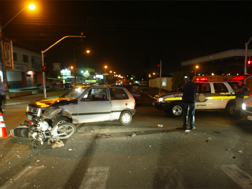 Um acidente entre uma moto e um carro na noite desta segunda-feira (22) deixou os dois condutores feridos. A colisão aconteceu entre as ruas Natal e dos Ferroviários, no bairro Cajuru, na capital do estado.