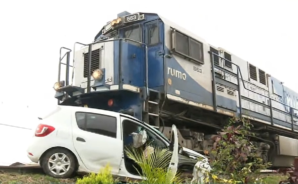 Equipes da empresa Rumo Logística, concessionária responsável pelo trem e que administra a linha férrea, estão no local para manobrar a locomotiva e ajudar na retirada do veículo dos trilhos.