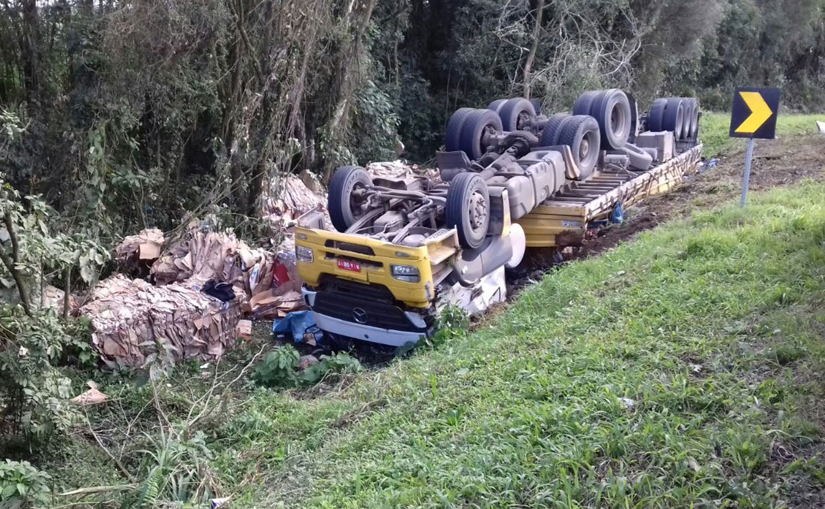 O veículo, que estava carregado com papelão, ficou de rodas para o ar em um trecho de curva da rodovia. O motorista relatou para a Polícia Rodoviária Federal (PRF) que teria passado mal. Por poucos minutos o condutor ficou preso na cabine do caminhão, mas foi retirado com ferimentos leves.