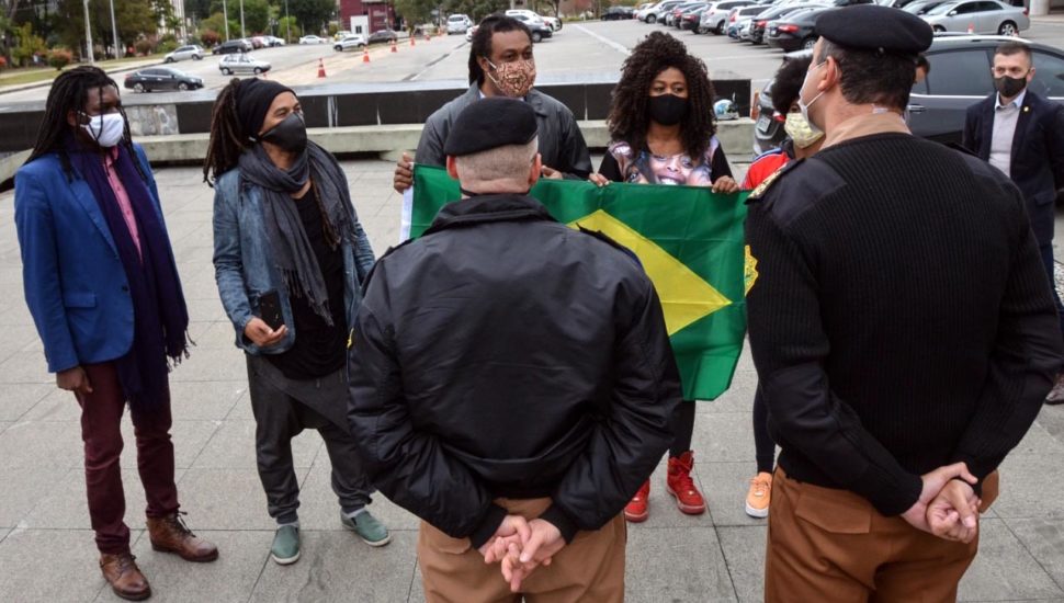 Representantes do Movimento Negro Organizado de Curitiba fizeram a entrega simbólica da bandeira do Brasil ao chefe da Casa Militar do Governo, o tenente-coronel Welby Pereira de Sales, em frente ao Palácio do Iguaçu.