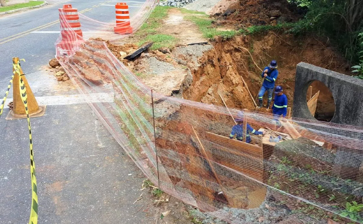 Um grande buraco se abriu bem na beirada do córrego que desemboca no Parque Tingui. O buraco é grande e trabalhadores da Prefeitura trabalham no conserto do local. Na manhã desta terça-feira a mureta de proteção caiu após parte do barranco escorregar pra dentro do córrego.