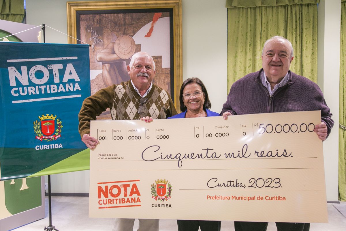 Os prêmios de mais um sorteio do programa Nota Curitibana foram entregues pelo prefeito Rafael Greca, na segunda-feira (3), em Curitiba. O prêmio principal, de R$ 50 mil, foi para o policial rodoviário aposentado Celso Ronaldo Dias. O segundo, de R$ 20 mil, para a empresária Julyane Alves Ospedal Rosa Iurk. E o terceiro, de R$ 10 mil, para o corretor Jonatas Ribeiro de Castro. E os ganhadores revelaram como pretendem gastar seus prêmios!