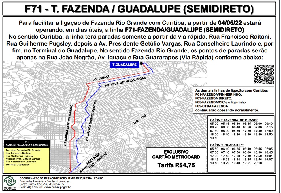 A nova linha fará uma conexão semidireta entre o Terminal de Fazenda Rio Grande e o Terminal Guadalupe, em Curitiba, com operação nos horários de pico dos dias úteis e tarifa de R$ 4,75 para pagamento em cartão.