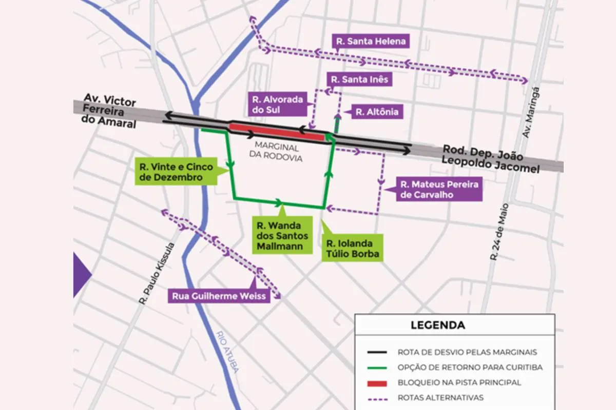 O tráfego será mantido nos dois sentidos, mas desviado para as pistas marginais. No sentido Curitiba–Pinhais, o bloqueio ocorrerá entre as ruas 25 de Dezembro e Iolanda Túlio Borba. Na direção contrária, Pinhais–Curitiba, o fechamento será entre as ruas Altônia e Santa Helena.