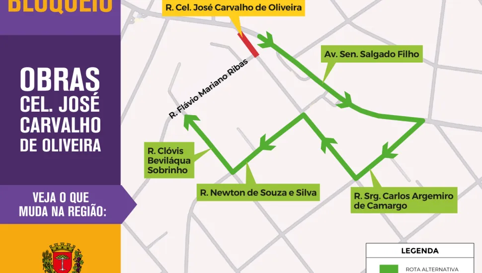 Já na quarta-feira (19/1), começa o bloqueio na Rua Flávio Mariano Ribas, no cruzamento com a Rua Coronel José Carvalho de Oliveira, até 25 de janeiro. O desvio será pela Avenida Salgado Filho e Rua Sargento Carlos Argemiro de Camargo.