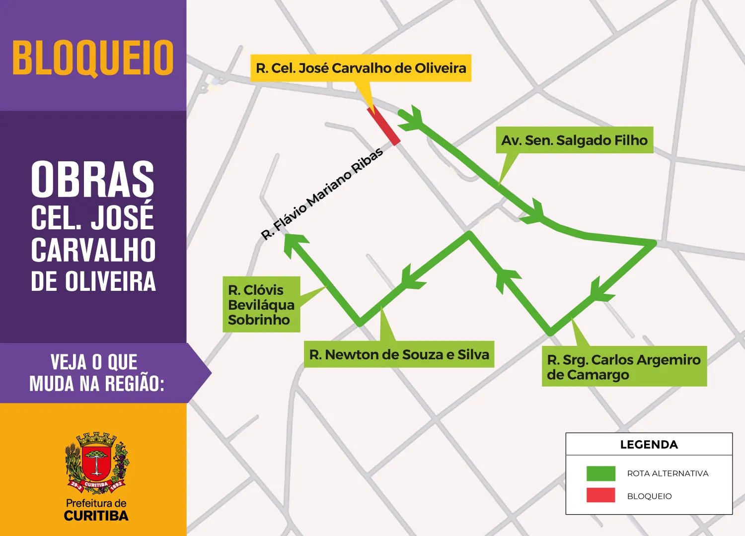 Já na quarta-feira (19/1), começa o bloqueio na Rua Flávio Mariano Ribas, no cruzamento com a Rua Coronel José Carvalho de Oliveira, até 25 de janeiro. O desvio será pela Avenida Salgado Filho e Rua Sargento Carlos Argemiro de Camargo.