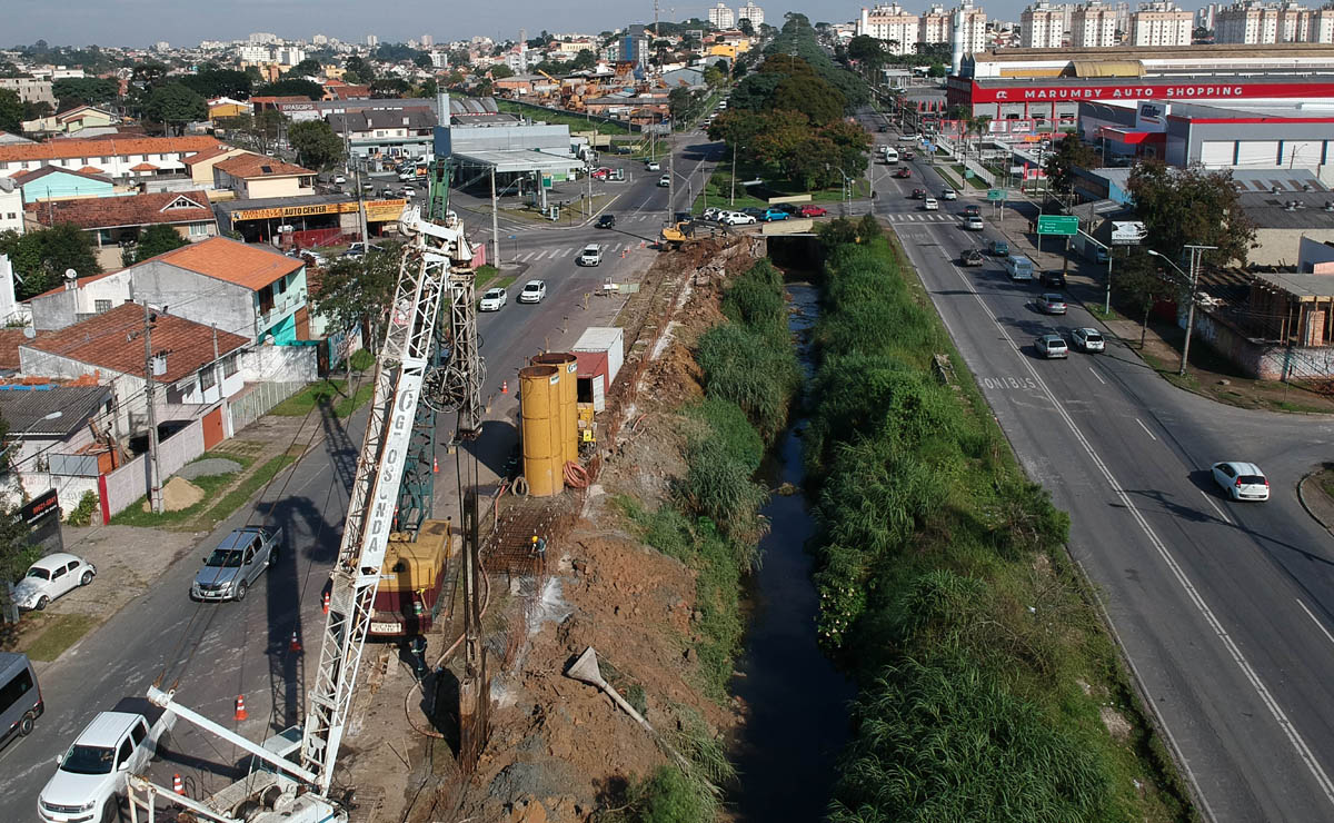 Uma dessas etapas está acontecendo na Avenida Wenceslau Braz, na Vila Guaíra, por onde corre o rio que deságua no Belém. Ali, as equipes trabalham com grandes máquinas para fazer a contenção na lateral das margens e também construindo as caixas que vão reter as águas das fortes chuvas, evitando as cheias e alagamentos na região.