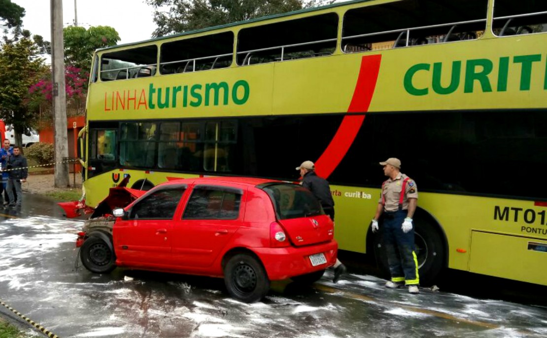 Policiais do Batalhão de Trânsito da Polícia Militar (BPTran) registraram a colisão. No ônibus, que transporta os passageiros aos pontos turísticos de Curitiba, ninguém se feriu.