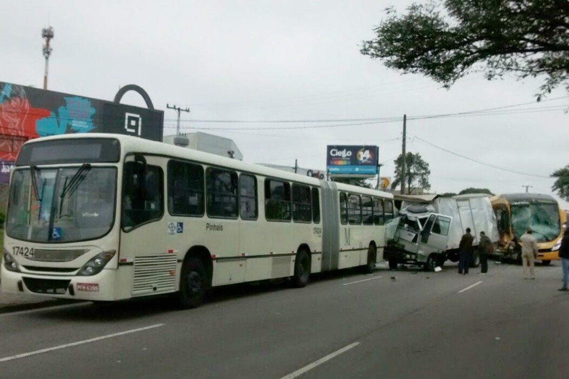 Dois ônibus, um caminhão e dois carros se envolveram em um engavetamento na manhã desta sexta-feira (16). O acidente aconteceu na Avenida Victor Ferreira do Amaral, perto do Departamento de Trânsito do Paraná (Detran-PR), no bairro Tarumã, em Curitiba, por volta das 7h40, e deixou duas pessoas feridas. Elas não correm risco de morte.