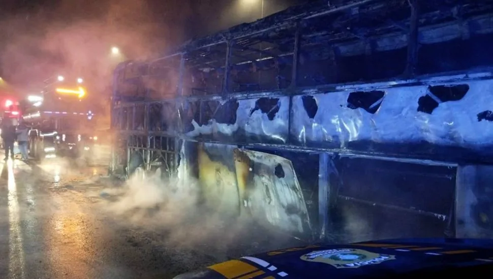 Uma cena impressionante chamou atenção de motoristas que trafegavam, na noite desta terça-feira (25), pelo km 668,3 na BR-376, na região de Guaratuba, litoral do Paraná. Um ônibus completamente incendiado motivou o bloqueio de uma das pistas da rodovia no sentido Santa Catarina.