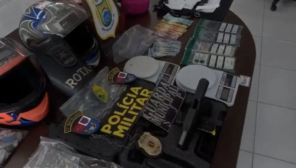 Nas residências vistoriadas, os policiais localizaram e apreenderam cinco armas de fogo, um simulacro, 48 munições, 15 celulares, dois veículos utilizados em crimes, 15 rádios comunicadores, balanças de precisão e R$ 1.072 em espécie.