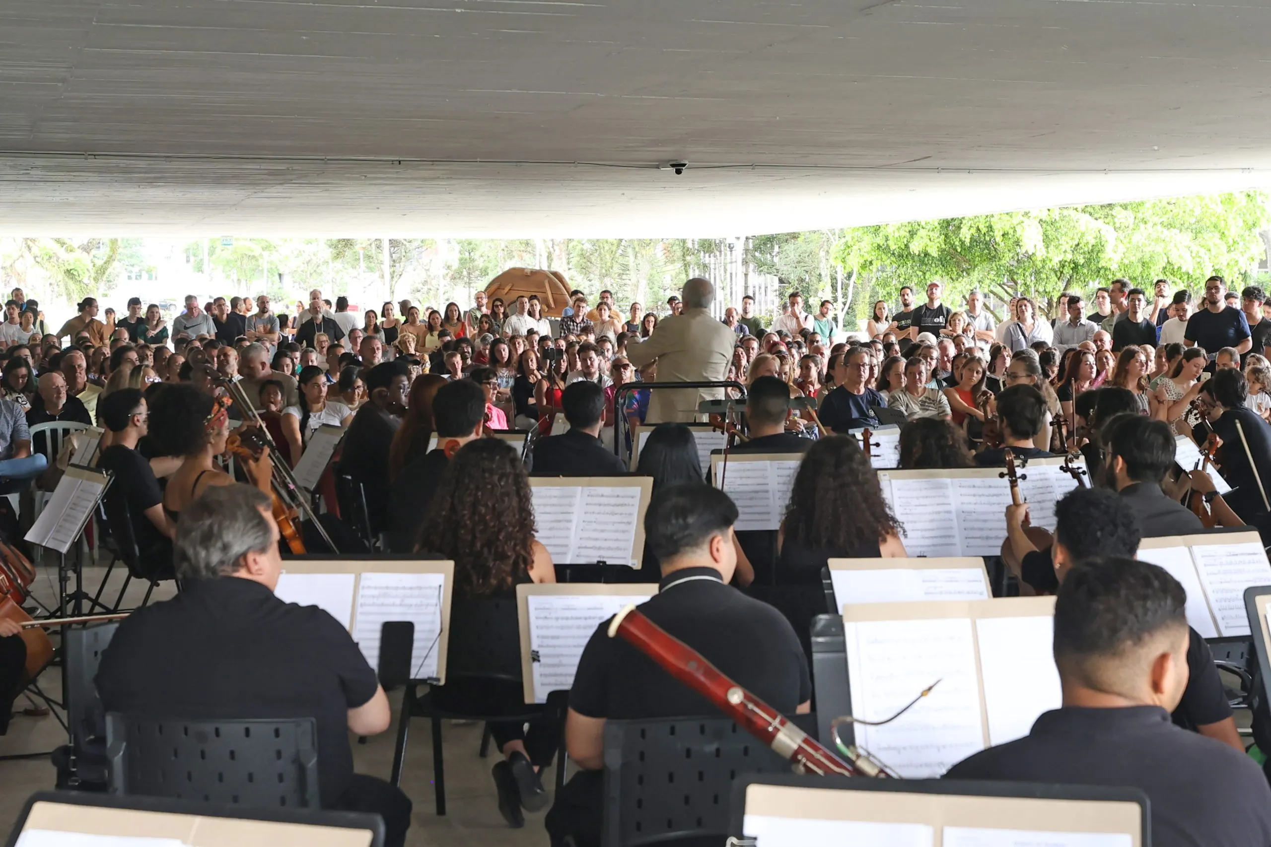 O vão livre do Museu Oscar Niemeyer (MON) ficou completamente lotado no domingo (11/1) para o concerto da Orquestra Sinfônica da 43ª Oficina de Música de Curitiba. A apresentação, regida por Abel Rocha, reuniu pessoas de todas as idades e foi dedicada ao universo da dança.