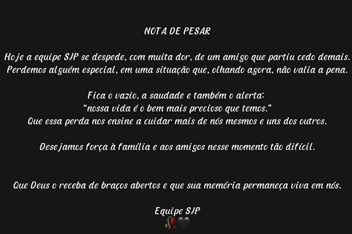 “Hoje a equipe SJP se despede, com muita dor, de um amigo que partiu cedo demais. Perdemos alguém especial, em uma situação que, olhando agora, não valia a pena. Fica o vazio, a saudade e também o alerta: “nossa vida é o bem mais precioso que temos.” Que essa perda nos ensine a cuidar mais de nós mesmos e uns dos outros. Desejamos força à família e aos amigos nesse momento tão difícil. Que Deus o receba de braços abertos e que sua memória permaneça viva em nós. Equipe SJP”, diz a nota.