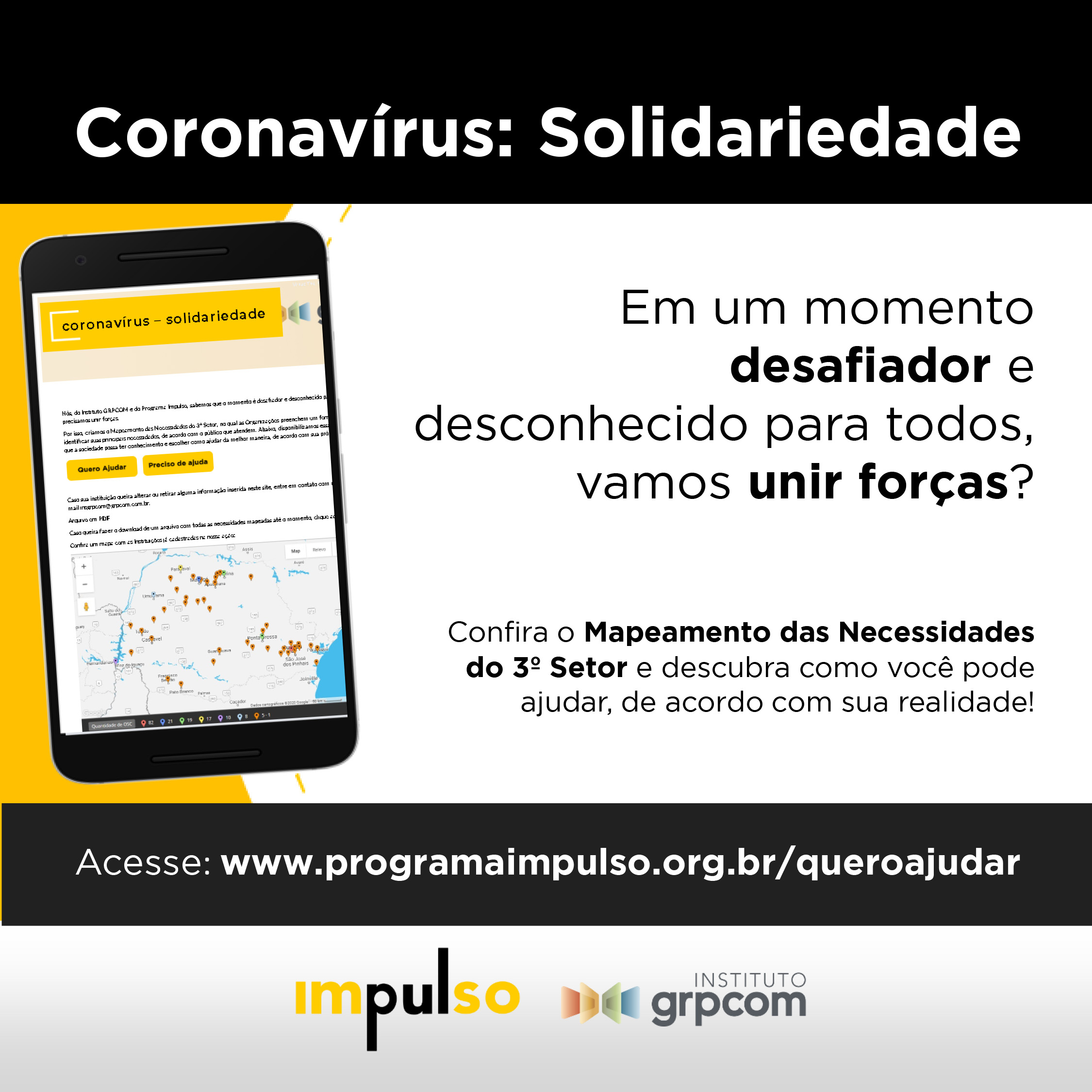 Como iniciativa adicional para amparar tais instituições, por intermédio do Programa Impulso, o Instituto GRPCOM criou uma plataforma que ajuda a conectar quem quer ajudar com quem mais precisa. Nesta plataforma está justamente o mapeamento mencionado pela Ana Gabriela. Se você precisa de ajuda ou quer ajudar, acesse o site do Program Impulso e contribua.