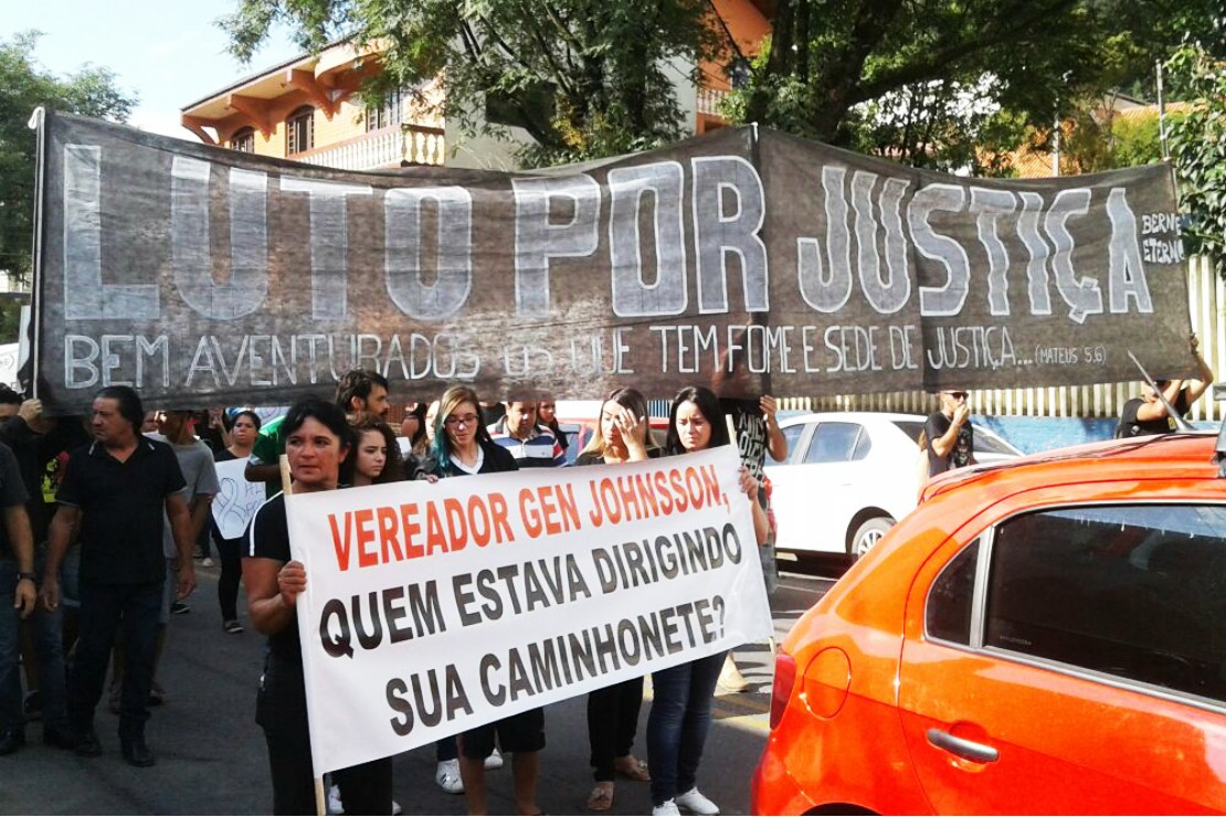 “Vereador Gen Johnsson, quem estava dirigindo sua caminhonete?”. Essa é a frase pintada em uma das faixas levantadas por dezenas de manifestantes no município de Rio Branco do Sul, Região Metropolitana de Curitiba, na tarde desta sexta-feira (24). Por volta das 15h, eles iniciaram a passeata pela cidade pedindo justiça pela morte do jovem Everton Luiz Vaz, de 27 anos, vítima de um acidente de trânsito envolvendo a caminhonete do vereador.