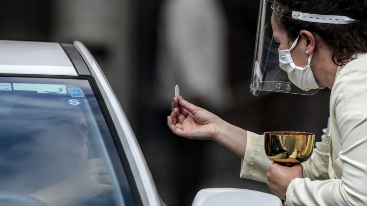 As celebrações religiosas de Páscoa em Curitiba foram adaptadas para evitar a transmissão do novo coronavírus. Por isso, esse ano, o Santuário da Nossa Senhora do Guadalupe, no Centro, está oferecendo nesta manhã, até o meio-dia, a hóstia consagrada aos fiéis pelo sistema drive thru. O momento da Eucaristia foi adaptado para evitar a transmissão do novo coronavírus entre os fiéis.
