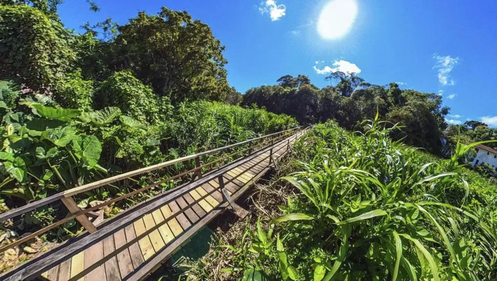 A passarela de madeira tem 25 metros de comprimento e fica sobre a nascente do Rio Belém. A reconstrução incluiu a troca de peças danificadas do tablado e do corrimão, além da recuperação das calçadas nas cabeceiras dos dois lados para melhorar a mobilidade dos moradores.