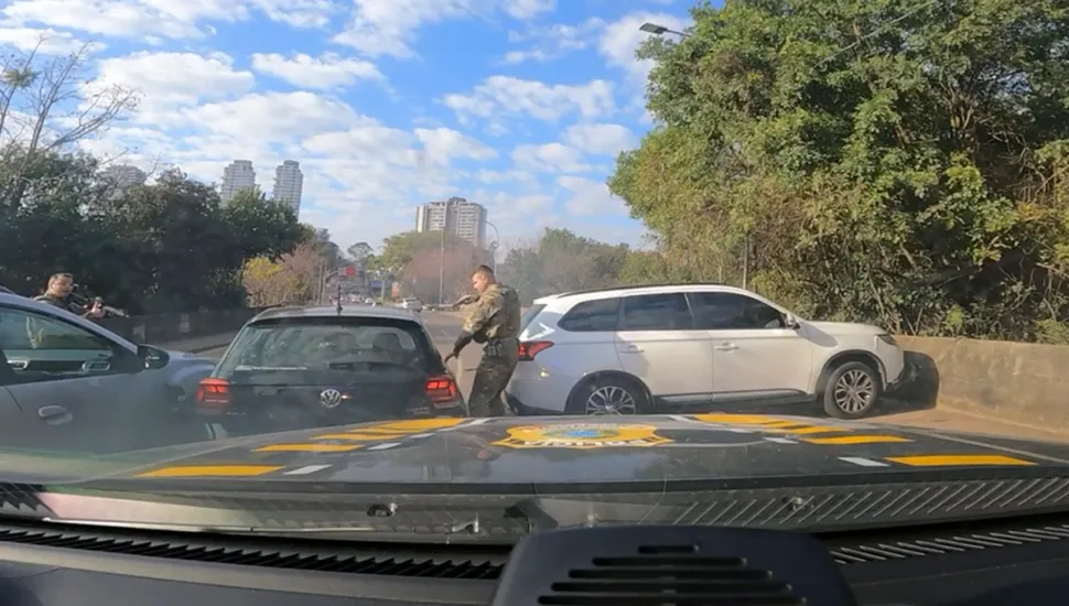 Após o impacto, o carro suspeito ficou imobilizado entre dois veículos. Os policiais conseguiram abordá-lo e prenderam o condutor, um homem de 25 anos.