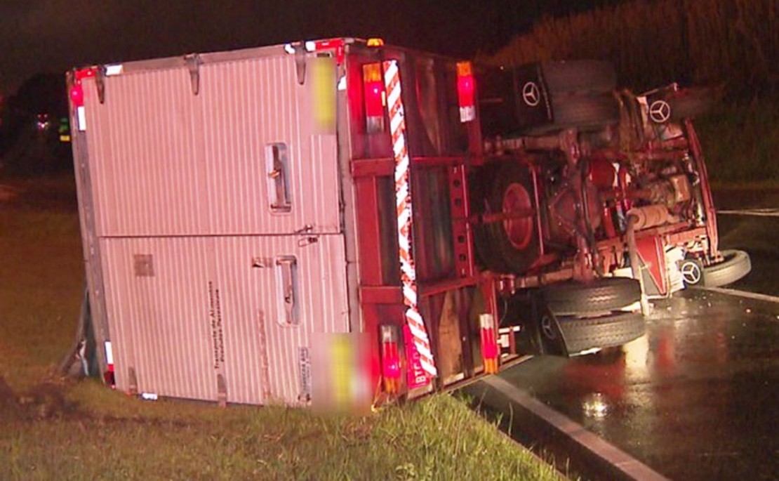 O motorista de um caminhão carregado com frios que trafegava pelo Contorno Norte, em Curitiba, ficou ferido depois de capotar com o veículo na madrugada dessa sexta-feira (14). O acidente aconteceu na altura do km 1, bairro Orleans, depois que o condutor perdeu o controle da direção. Segundo socorristas que atenderam a ocorrência, o tombamento pode ter sido ocasionado pela umidade da pista no momento em que o caminhão circulava pelo local.
