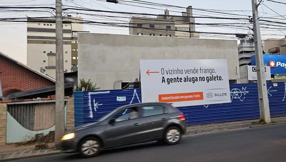 A Sillos Imóveis, responsável pela locação do prédio construído onde ficava a videolocadora Nobel (essa é só pros antigos mesmo), teve a grande sacada de brincar com o vizinho, o tradicional restaurante italiano La Casa Di Frango. Espirituosa, a frase cita o termo “galeto” (frango “novo”, abatido com pouca idade), expressão popular em Curitiba que significa “rápido”, para completar o gracejo.
