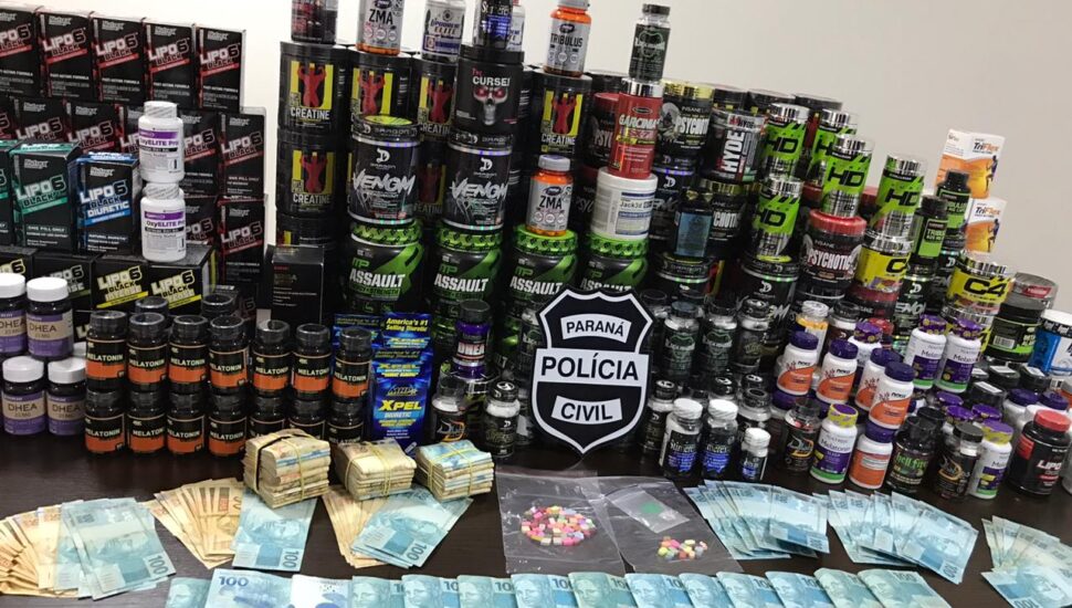A Polícia Civil fez uma operação, nesta quarta-feira (8), em lojas de suplementos de Curitiba para apreender produtos falsos ou de venda proibida no Brasil. Os policiais cumpriram mandato de busca e apreensão em sete locais, sendo três lojas de suplementação de academia e quatro residências. Com um dos suspeitos, também foi encontrado drogas e ele foi preso em flagrante por tráfico de drogas.